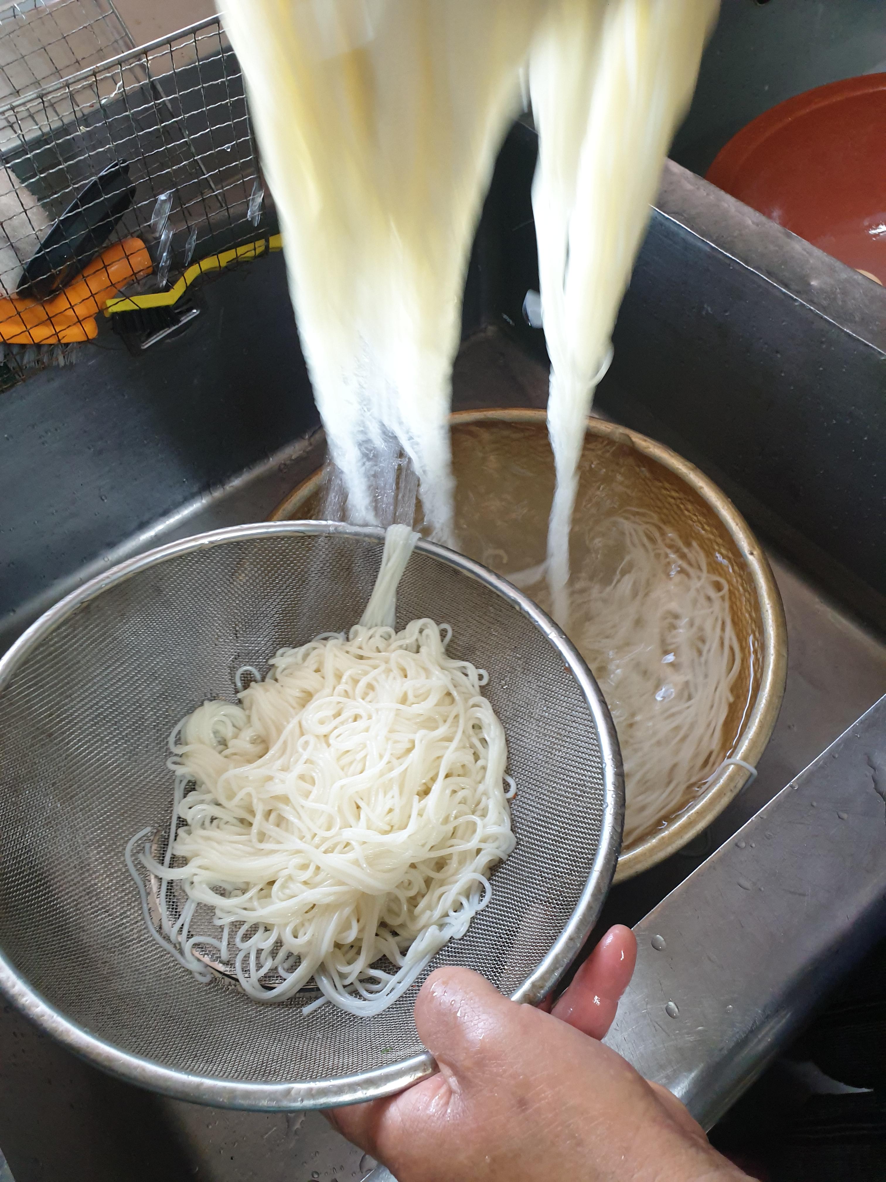 삶은 면을 찬물로 헹구고 체에 받쳐 물기를 뺀다.