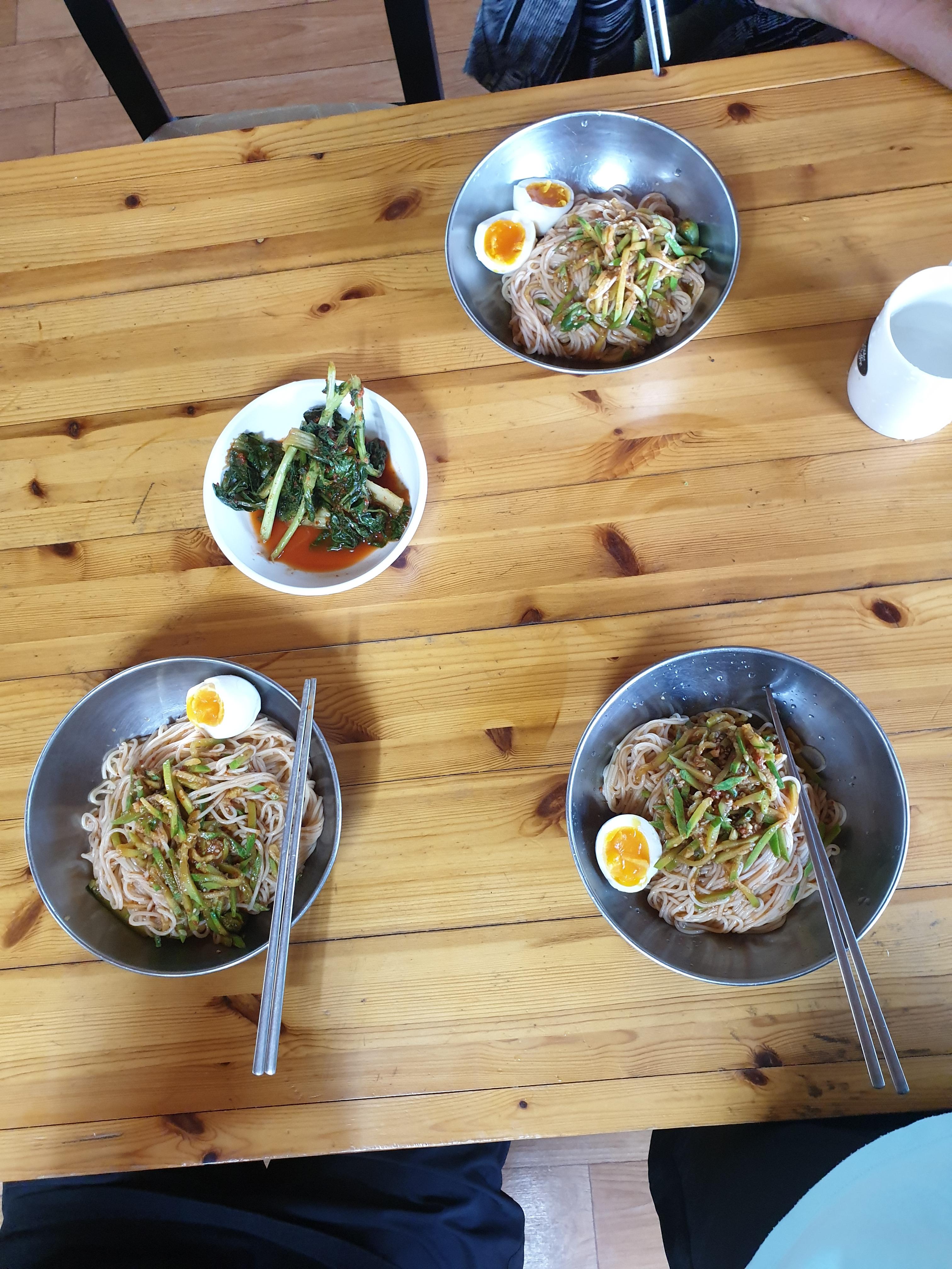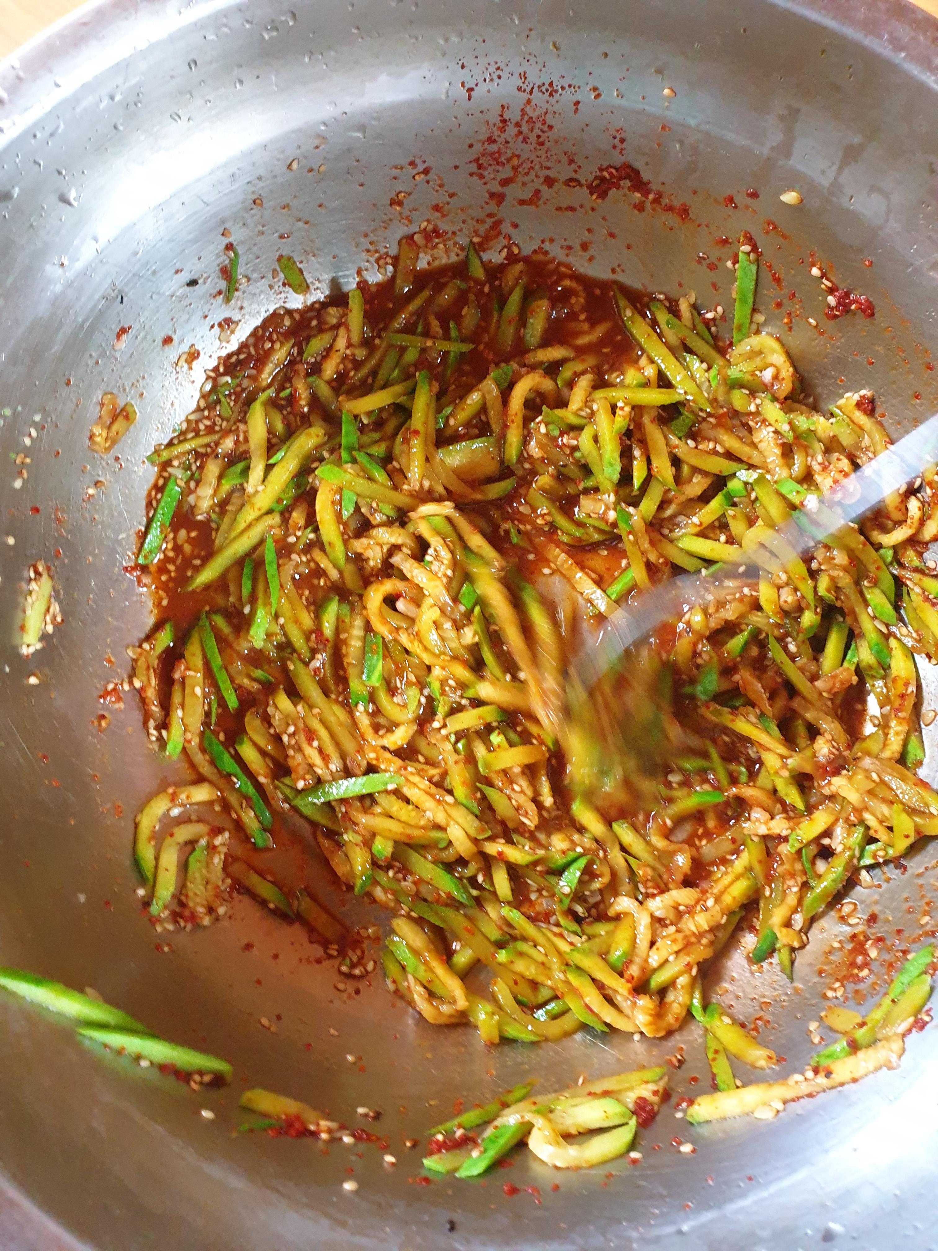 호박채썰기: 채칼로 썬다. 국수 삶기전 물이 끓을때 호박을 데쳐서 건져내고 양념에 호박넣기